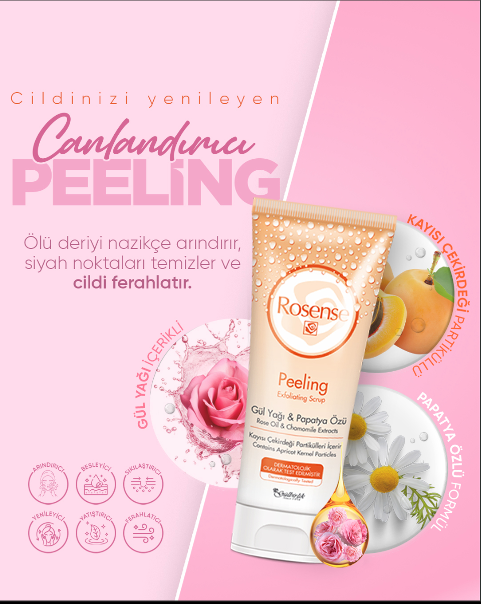 Cildinizi ölü deriden arındırmanın ve yenilemenin tam zamanı! 🌹 Rosense Peeling, siyah noktaları derinlemesine temizlerken, mikrokapsül vitaminler, gül yağı ve papatya özü sayesinde cildinizi besler, sıkılaştırır ve ferah bir his bırakır 💧✨ Tüm cilt tipleri için uygundur🧡